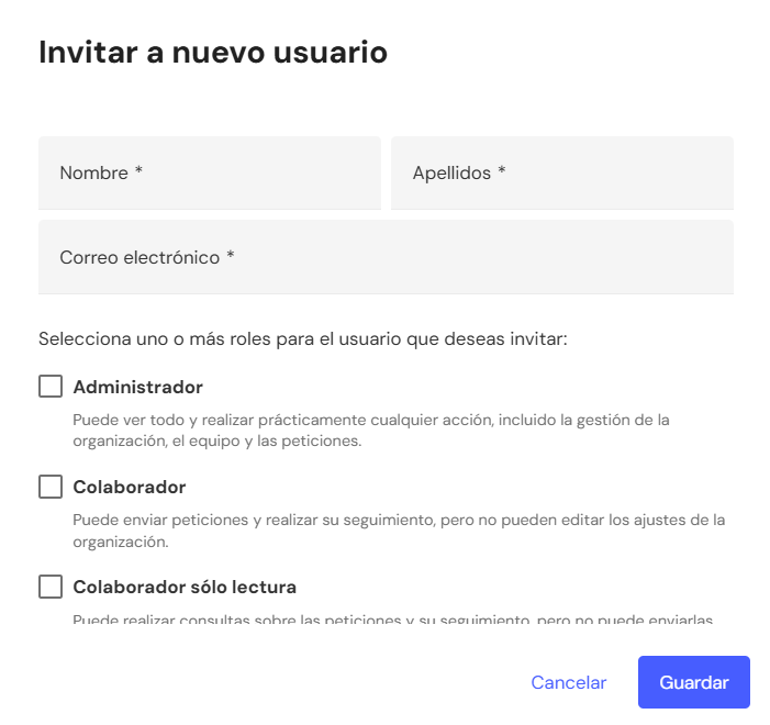 Colaborador → Puede enviar peticiones y hacer su seguimiento, pero no modificar los ajustes de la organización.