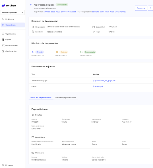- Datos del pago solicitado: lo que se pidió inicialmente (importe, tipo de pago, transferencia, concepto, beneficiario, ordenante, etc.).
